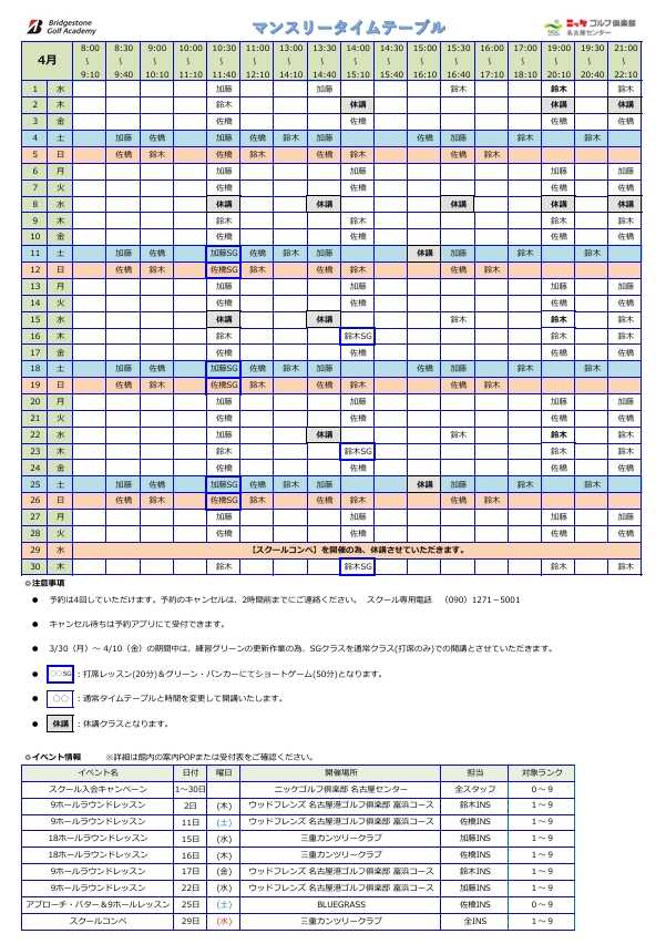 NEWS お知らせ 2026/03/29 お知らせ 🌸4月マンスリータイムテーブル 👇👇下記からも確認できます👇👇 マンスリータイムテーブル202604 ニッケゴルフ倶楽部一覧 名古屋センター一覧に戻る SNS CONTACT お問い合わせはこちら 当社へのご相談、ご依頼等ございましたら下記のフォームにてお気軽にお問い合わせください。 お問い合わせ